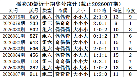 开奖回归:福彩3D第2026087期奖号为911,奖号样式为:组三、大小小、1:2:0、奇奇奇。