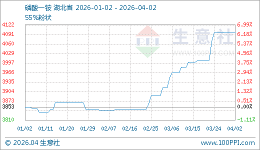 据商业社监测,磷酸一铵04月02日最新价钱4096.67元/吨,最近30天高涨4.60%,60天高涨6.50%。
