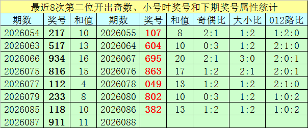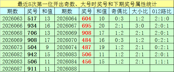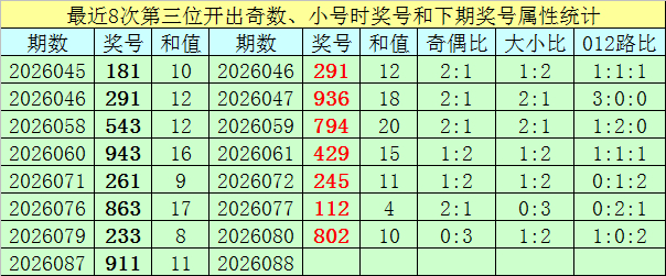 上期总结:福彩3D第2026087期开出奖号为911,奖号奇偶比为3:0,大小比为1:2,012路比1:2:0。