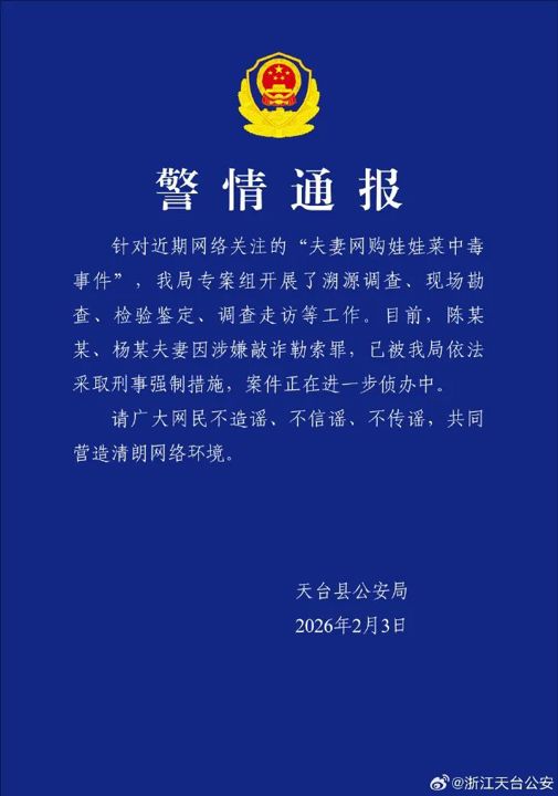 针对近期网络关注的"夫妻网购娃娃菜中毒事件",我局专案组开展了溯源调查,现场勘查,检验鉴定,调查走访等工作。目前,陈某某,杨某夫妻因涉嫌敲诈勒索罪,已被我局依法采取刑事强制措施,案件正在进一步侦办中。请广大网民不造谣,不信谣,不传谣,共同营造清朗网络环境。
