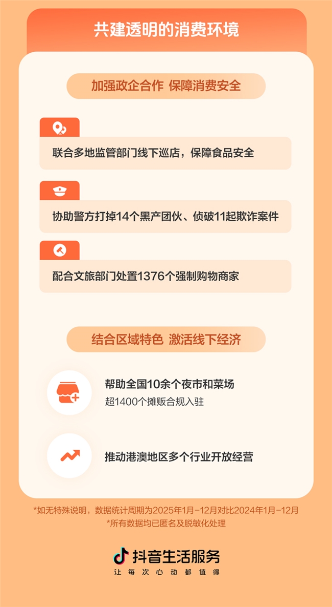 诠释判辨,抖音活命职业积极加强与社会各界配合,共同推动净化网罗花消环境,保险花消者职权,助力线下经济发展。2025年,平台聚会多地监管部门线下巡铺保险食物安全,协助多地警方打掉14个黑产团伙,侦破11起欺骗案件,配合文旅部门处置1376个强制购物商家。